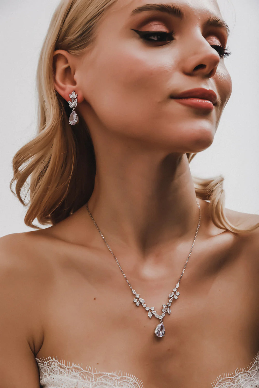 This set includes a beautiful necklace and matching earrings. Made with nickel-free stainless steel and plated in 14k white gold, this set is the perfect embodiment of elegance and sophistication. Unlike traditional jewelry, this set won't tarnish, ensuring it remains a cherished keepsake for years to come.