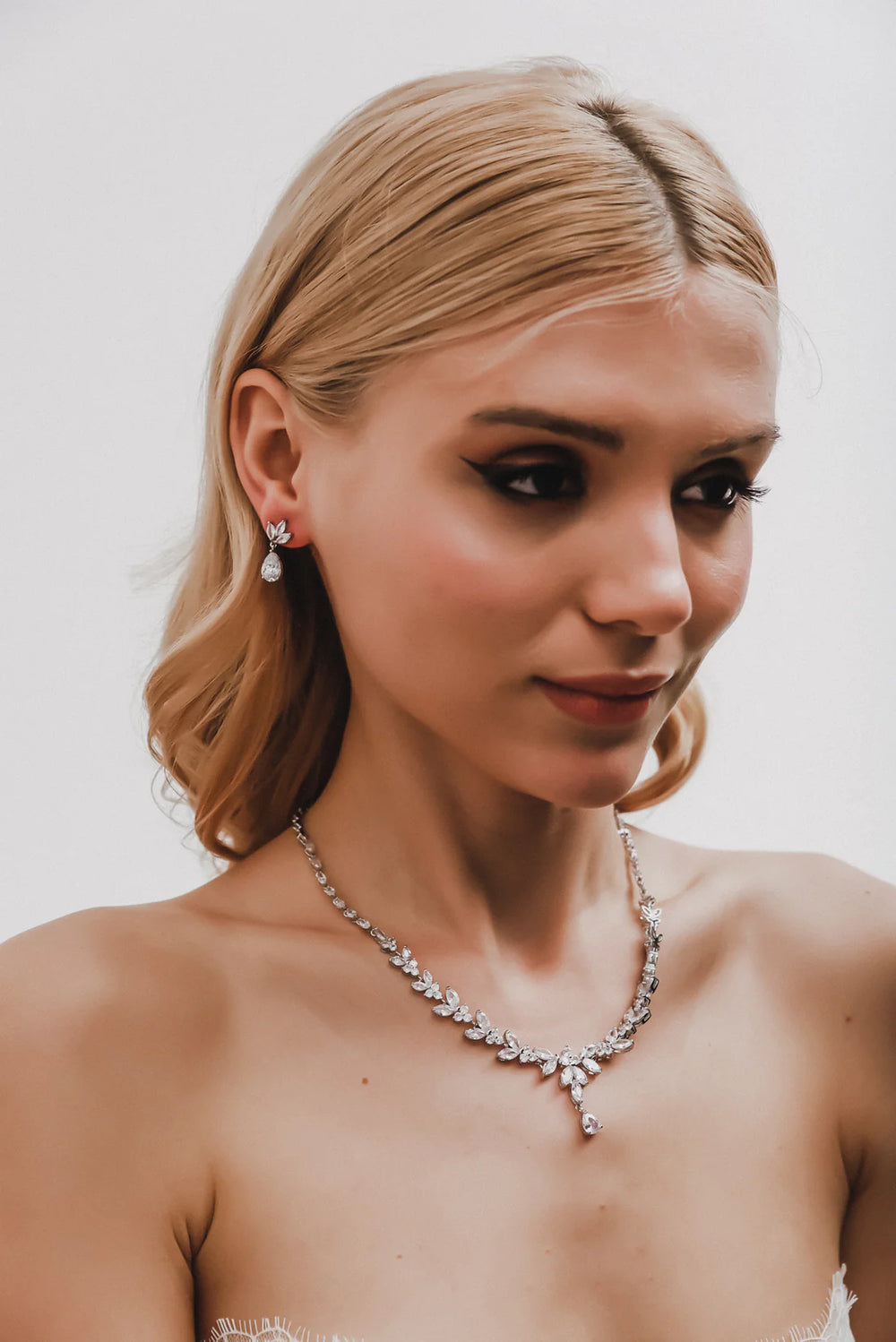 This set includes a beautiful necklace and matching earrings. Made with nickel-free stainless steel and plated in 14k white gold, this set is the perfect embodiment of elegance and sophistication. Unlike traditional jewelry, this set won't tarnish, ensuring it remains a cherished keepsake for years to come.
