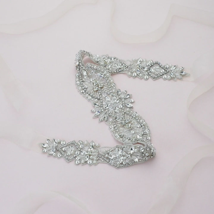 This belt is beautifully crafted with CZ rhinestones, and accented with pearl and glass beads, and can be made with satin or organza ribbons.