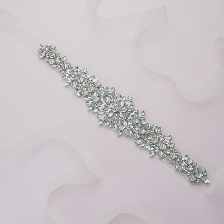 This belt is beautifully crafted with CZ rhinestones, and accented with pearl beads, and can be made with satin or organza ribbons.