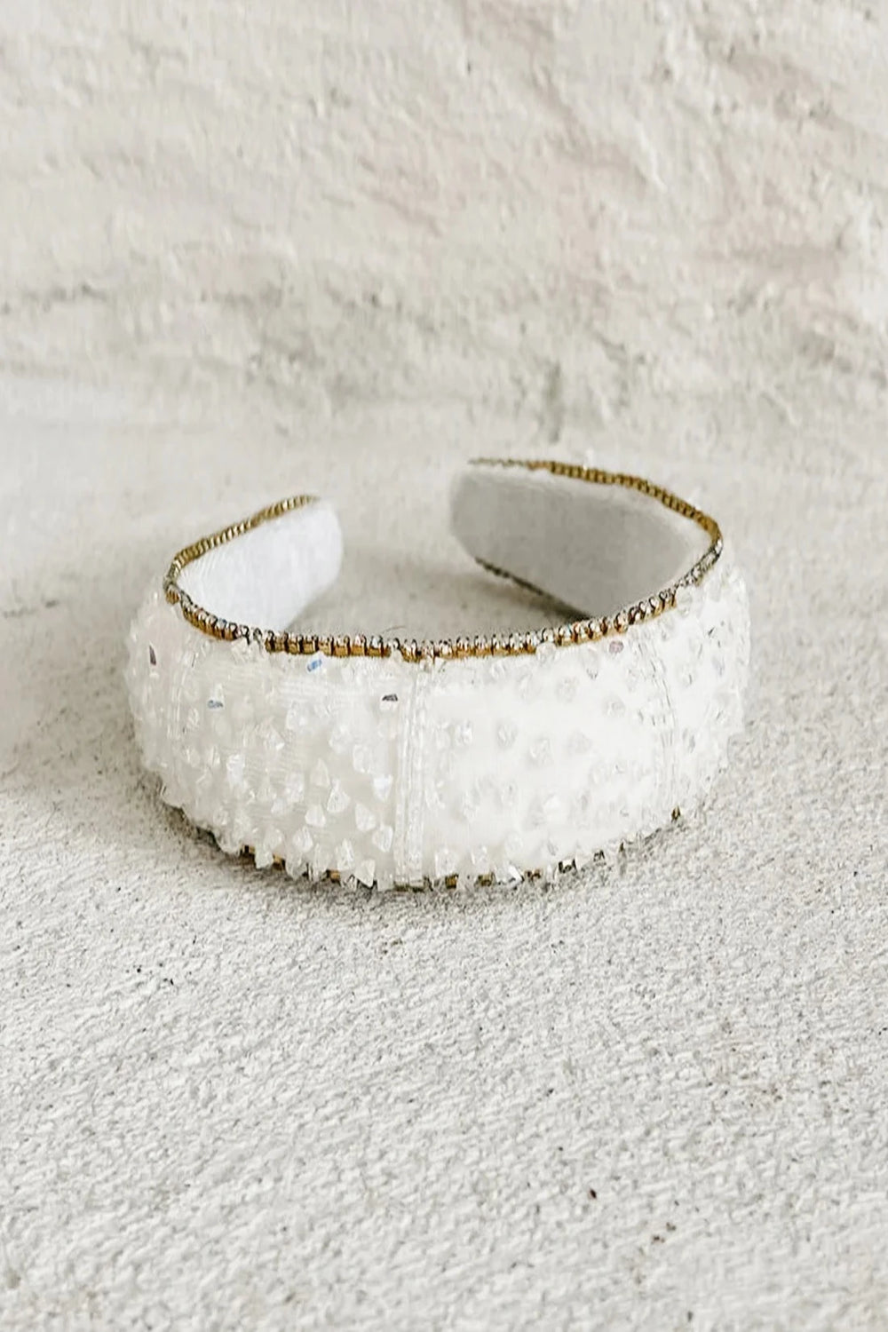 This beautiful chunky headband is hand beaded with hundreds of crystals and rhinestones and is lined with a soft cream velvet on the inside.