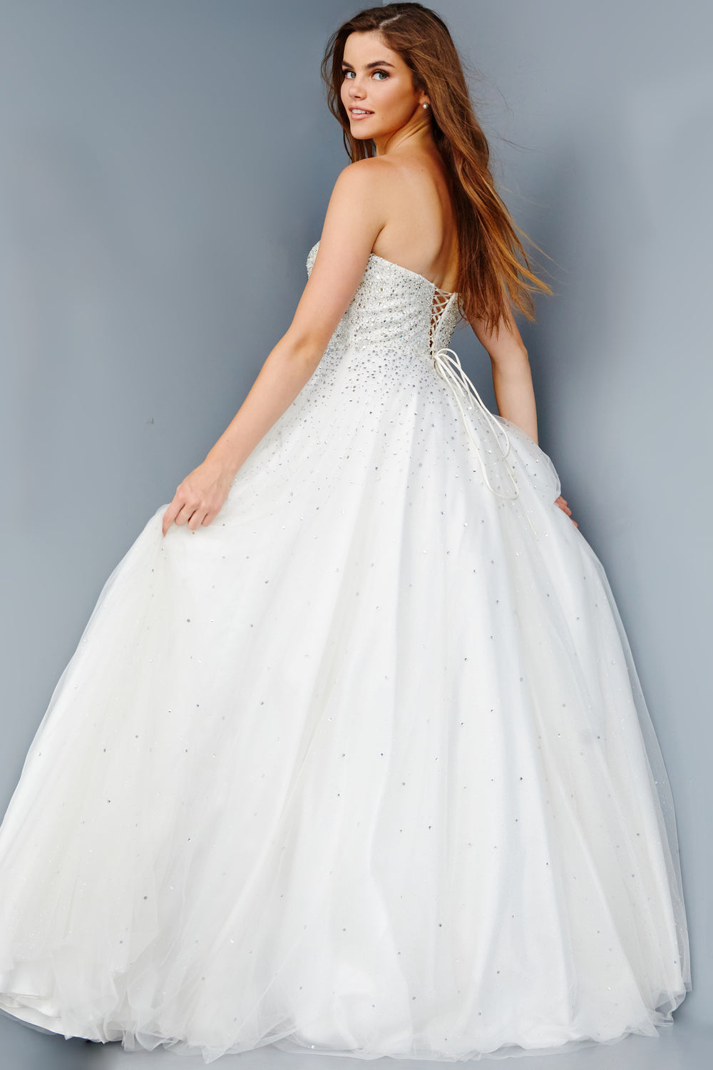 Embellished tulle ballgown, fully lined, full floor length skirt, strapless bodice, straight neckline, lace up back.