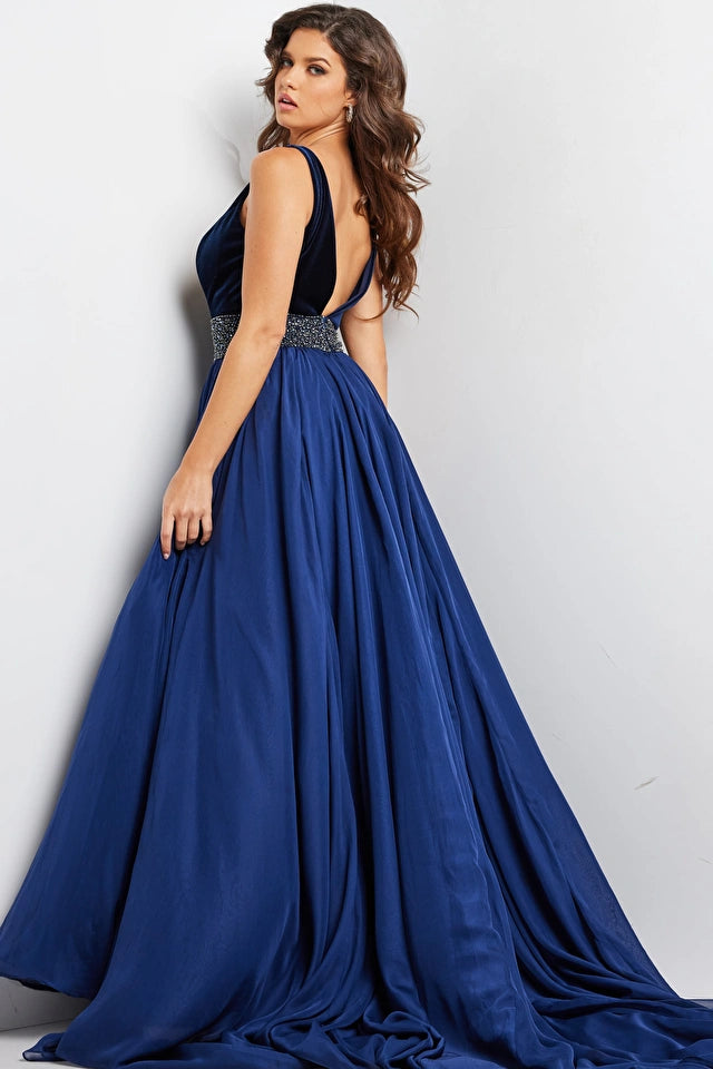 The Jovani 26201 is a timeless and elegant choice for formal events, combining the richness of velvet, the lightness of chiffon, and the sparkle of the embellished belt. Whether you opt for the classic navy, the bold black/white, the vibrant red, or the pristine white, this gown is designed to make a lasting impression with its thoughtful details and sophisticated silhouette.
